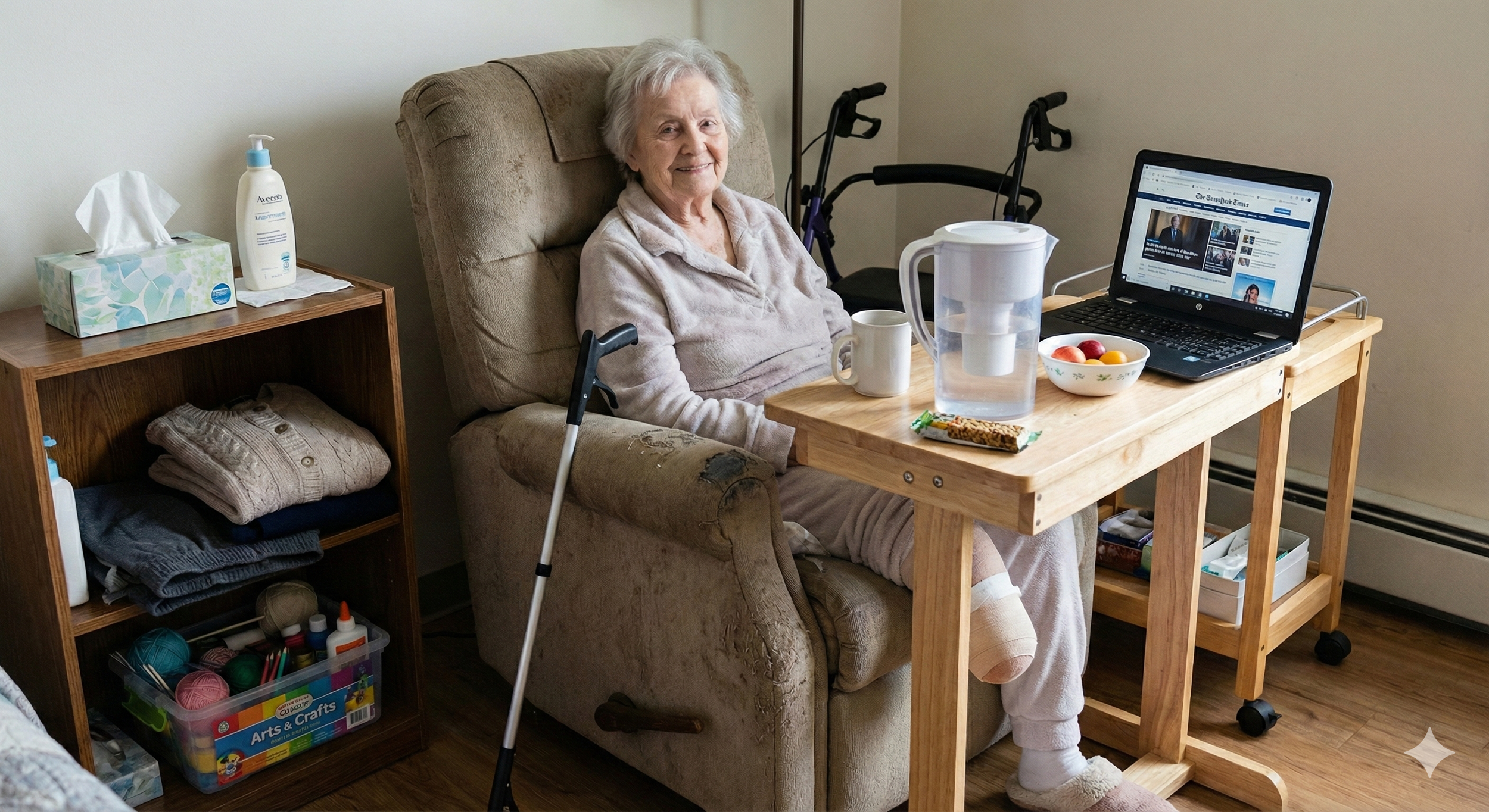 Diagram of a home showing different health and support services provided within the house, including family support, meal preparation, personal hygiene, daily living assistance, and outdoor help, emphasizing compassionate home health care.