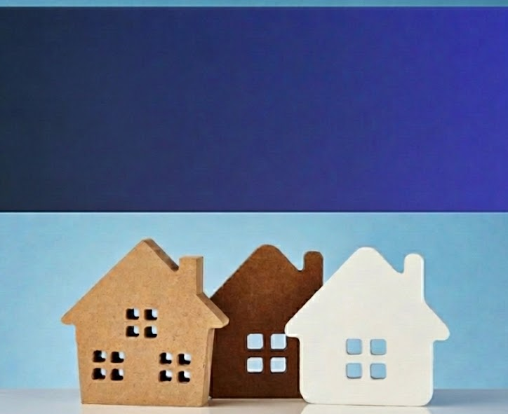 Tools and materials for building a small wooden house, including wooden frames, nails, hammer, tape measure, wire cutters, and gloves on a wooden surface.